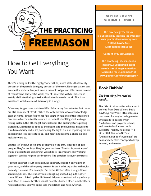 On September 1, 2019 we launched The Practicing Freemason, a newsletter of lodge instruction, talking points, and other exercises of self-craft. For only $1 per month, you can be a hero at your lodge, and bring in a stack of printed copies for your brothers, or just enjoy it all for yourself!